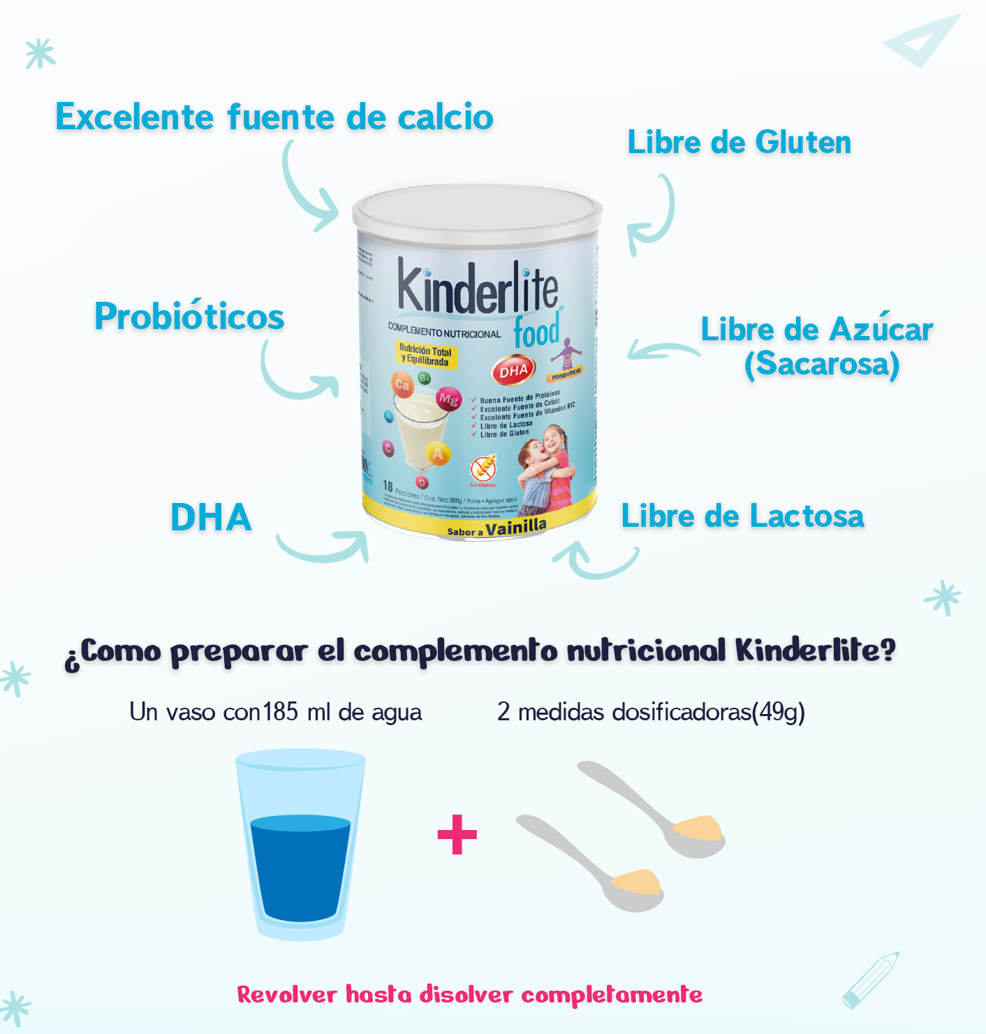 Complemento Nutricional Kinderlite es un alimento de uso médico especialmente formulado para apoyar el crecimiento y desarrollo de los niños y niñas.